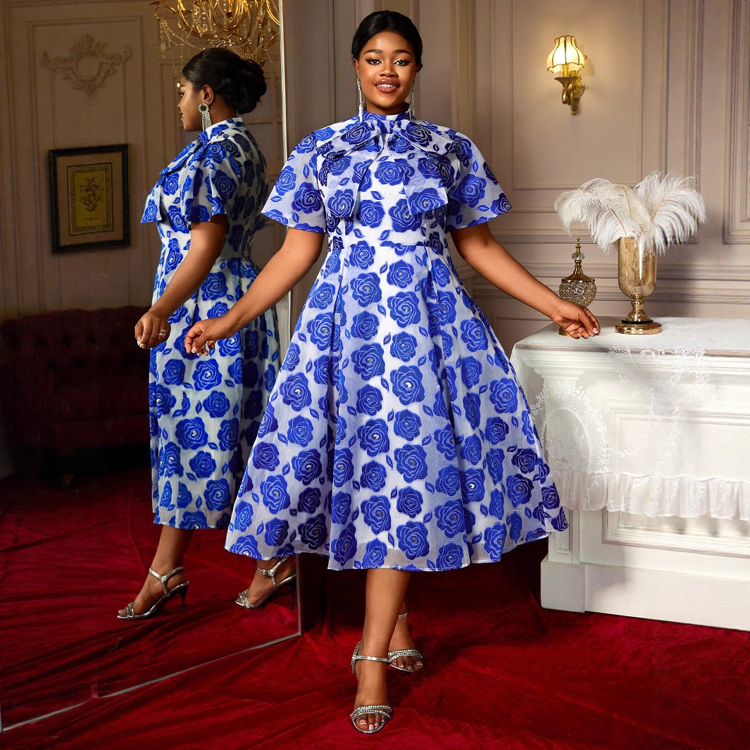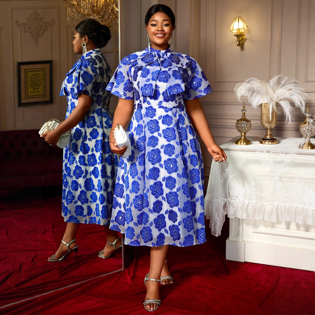 Half Turtleneck A- Line Tie Neckline Strap Bow Blue Embossed Dress