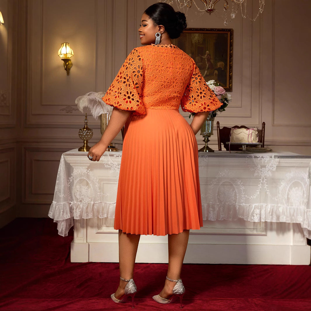 Lace Hollow Pattern Puff Sleeve V-neck Slimming A Swing Elegant Pleated Dress
