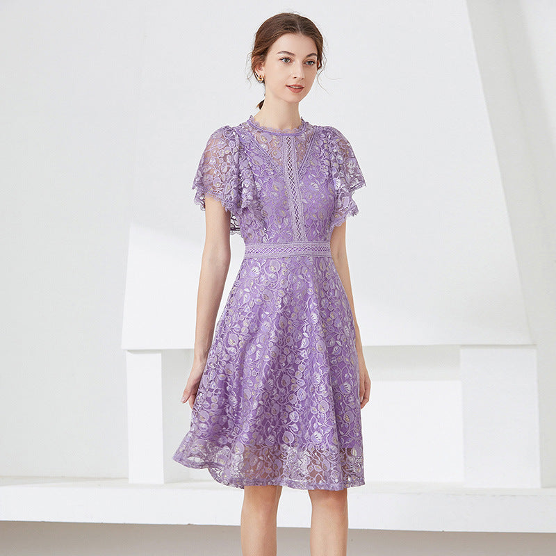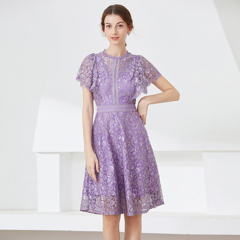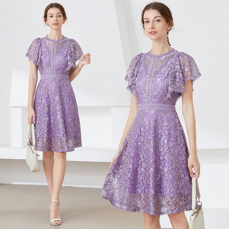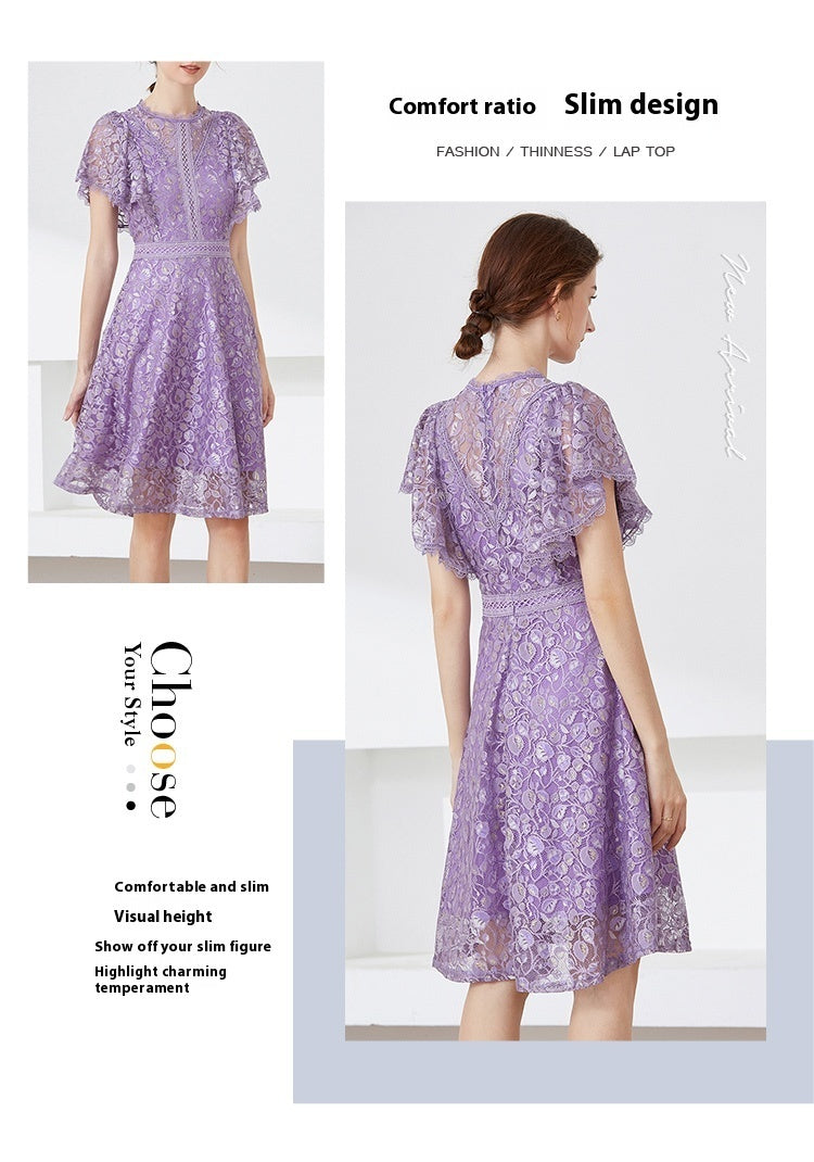 Lace Midi Dress Flying Sleeves Temperament Waist-controlled Slimming