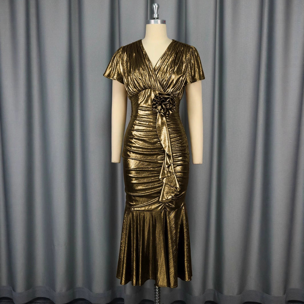 Three-dimensional Flower Waist Trimming Fashion V-neck Pleated Fishtail Skirt
