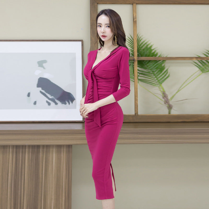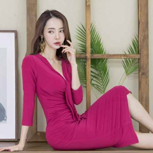 V Neck Slim Fit Over The Knee Mid Length Dress Pencil Skirt