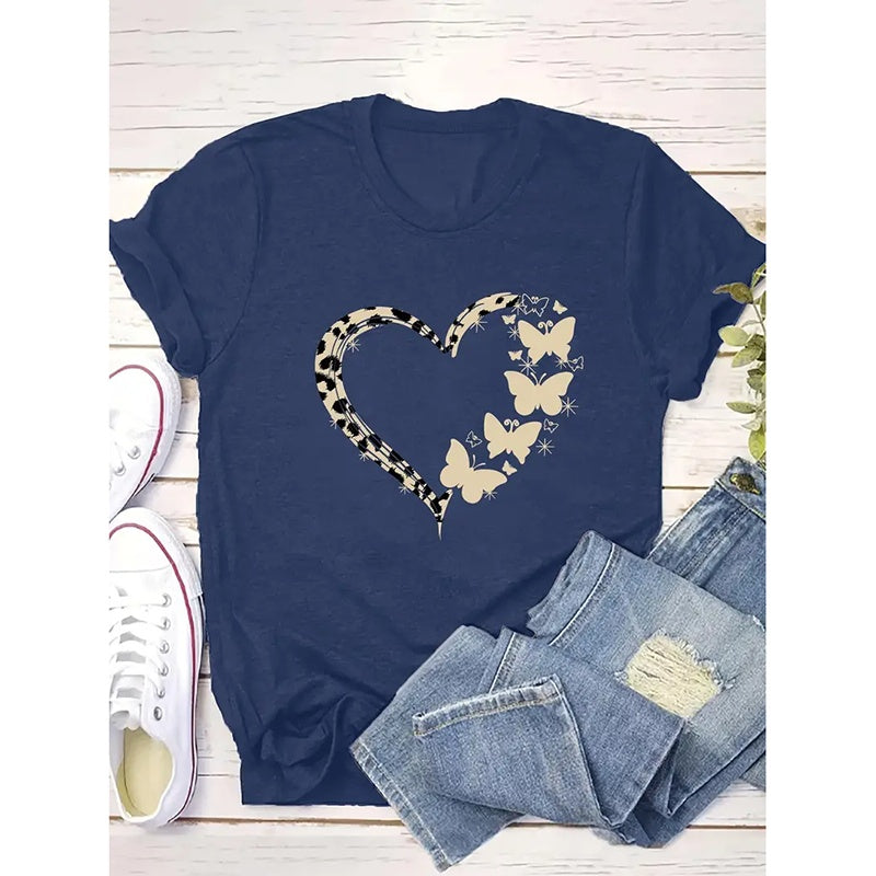 Women Cute Heart Graphic Shirt Summer Butterfly T-Shirt Short Sleeve Top Tees
