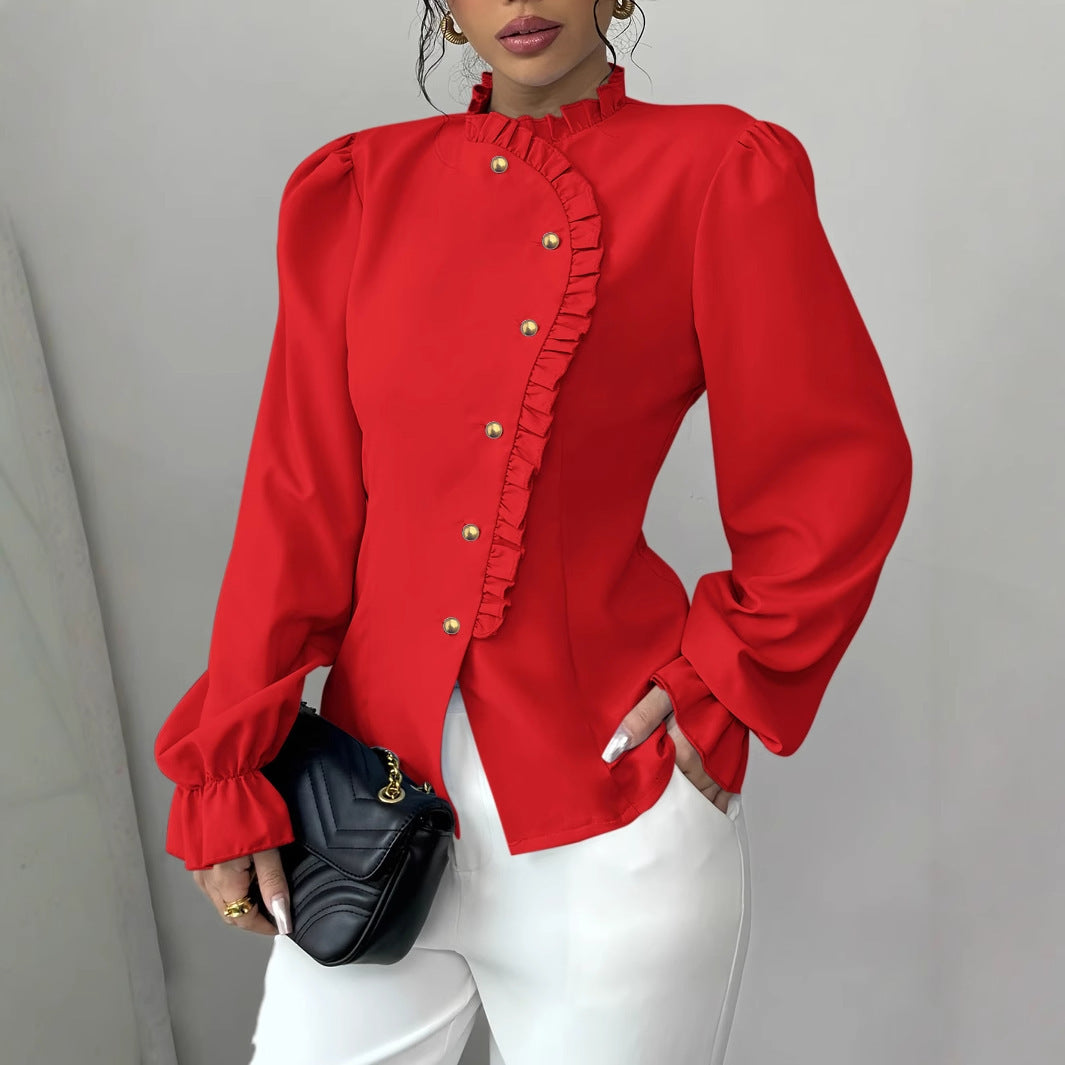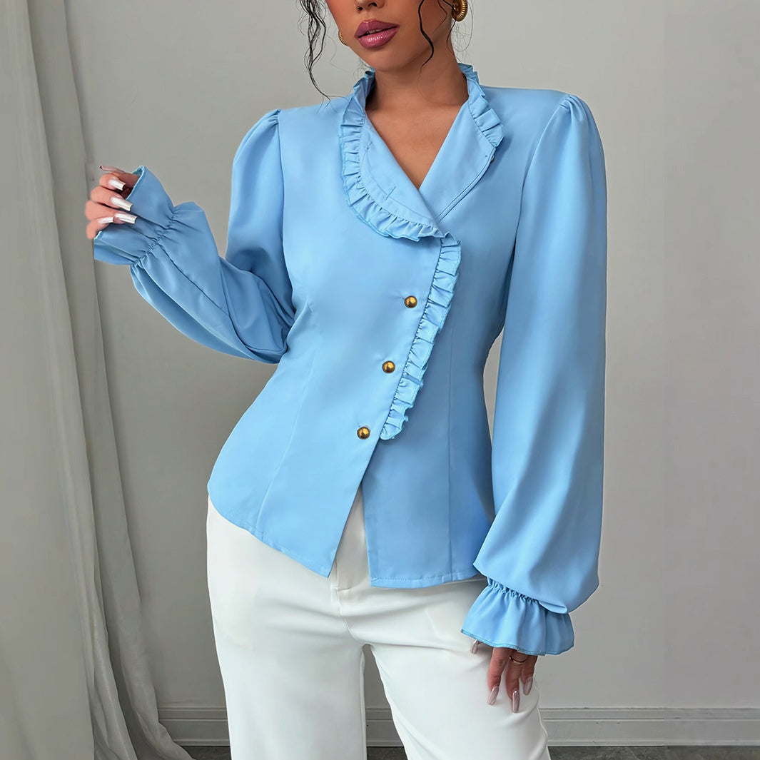 Women's Elegant French Asymmetrical Button-down Collar Ruffle Long Sleeve Blouse
